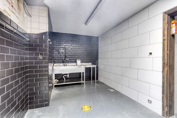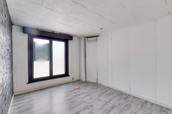 Het gelijkvloers beschikt over een ruime handelsruimte met zonnig, zuidgericht terras, een keukenruimte (keuken nog niet ingericht), een kelder en gescheiden toiletten. Aan de achterzijde is er parkeergelegenheid voor maar liefst drie wagens — een zeldzame troef in deze buurt.
