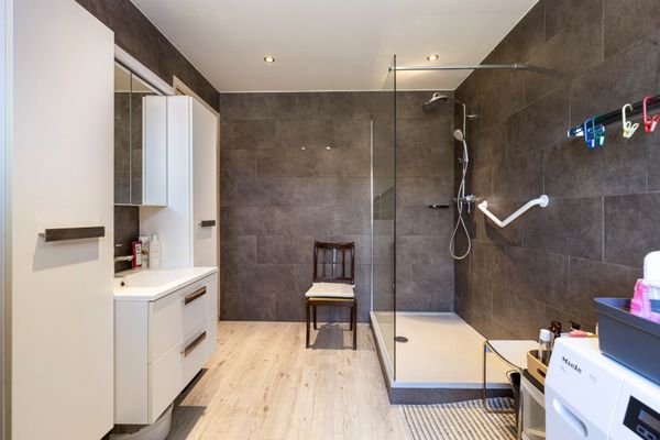 Op het gelijkvloers komt u binnen via de inkomhal met toegang tot een grote, droge kelder. De leefruimte met kachel en eetplaats sluit aan op een open keuken die uitgeeft op een veranda en een grotere zonnige stadstuin die breder is dan de woning zelf. Verder bevindt zich er ook een eerste badkamer met douche en toilet.