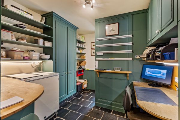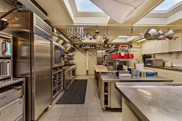 Een bar, een heel ruime volledig ingerichte keuken, meerdere koelruimtes, een bureel, een voorraadkelder met wasruimte…