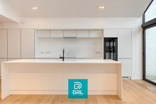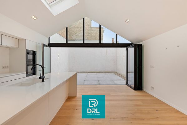 De royale leefruimte straalt rust en elegantie uit dankzij het massief parket, de originele houten balken en de sfeervolle gashaard. De op maat ontworpen keuken met kookeiland vormt een architecturaal statement en sluit perfect aan bij het open en lichtrijke karakter van de woning. Vloerverwarming op het gelijkvloers zorgt voor een optimaal comfortgevoel. Een volledig te openen raampartij verbindt de leefruimte naadloos met het zuid-zuidwestgericht terras. In de zomermaanden vloeien binnen en buiten harmonieus in elkaar over, waardoor het terras een natuurlijk verlengstuk wordt van de leefruimte — een zeldzame, private oase midden in de stad.