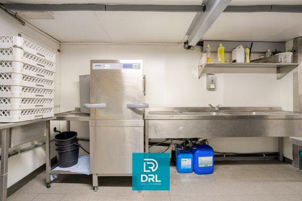 Het gelijkvloers bestaat uit een sfeervolle gelagzaal (70 couverts) met bar, momenteel uitgebaat als restaurant "La Coupole". In de zeer ruime tussen- en kelderverdieping bevindt zich een ultraprofessionele keuken, koelcel, praktische bergruimtes en zoveel meer. Het zonnig terras is een extra troef.